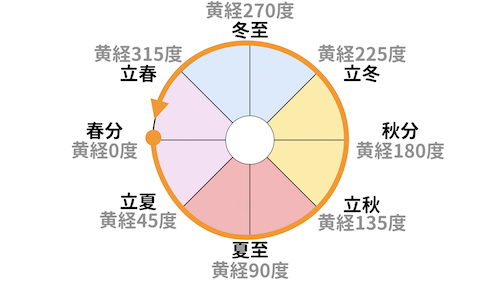 さらにそれをケーキを8等分するように斜めに線を引くと、その各ポイントは立夏・立秋・立冬・立春となるでしょう。
